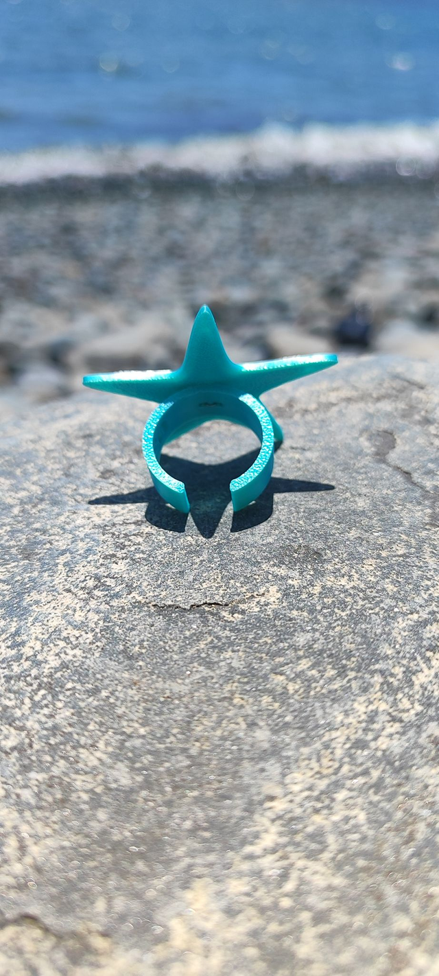Anillo de diseño único en forma de estrella de mar, perfecto para quienes buscan un toque marino y elegante en su look. Hecho a mano, fusionando la delicadeza del arte artesanal con la precisión de la tecnología de impresión 3D.