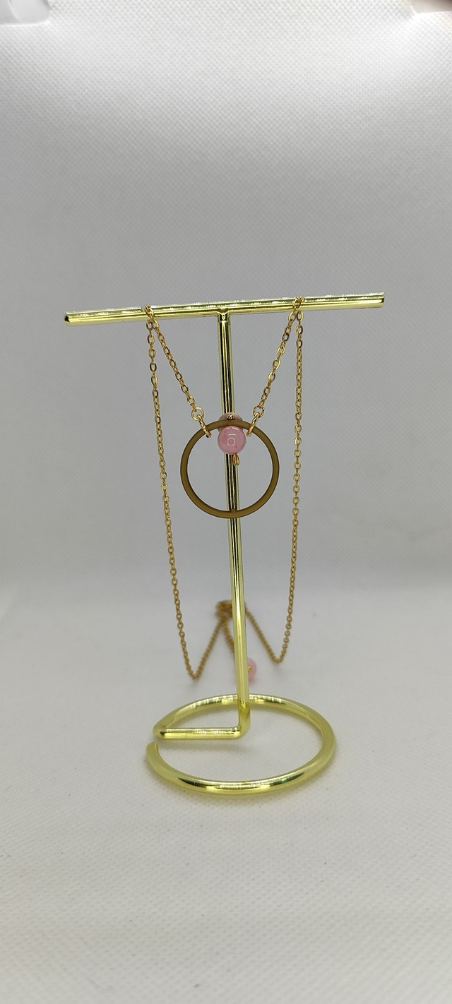 Su fina cadena dorada ajustable resalta la belleza de dos cuentas de cuarzo rosa , una piedra conocida por sus propiedades de amor propio y armonía emocional . La estructura equilibrada del aro central aporta un diseño sutil y elegante , ideal para quienes buscan una pieza versátil con significado profundo.