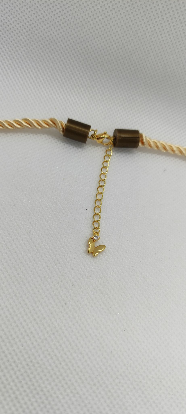 Su colgante de corazón facetado fusiona geometría y sofisticación, evocando la pasión de una rosa en plena floración . La combinación de rojo terciopelo y champagne seda simboliza amor propio, determinación y empoderamiento , mientras que el cordón trenzado en beige satinado envuelve el cuello con suavidad y elegancia. Como detalle final, su cierre ajustable incorpora una mariposa dorada , un símbolo de transformación y renacimiento .