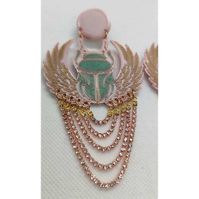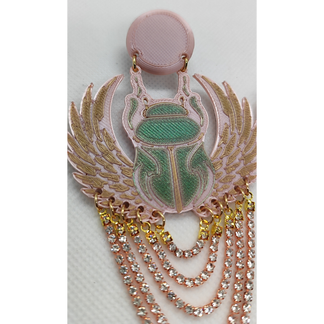 Pendientes impresos en 3D con escarabajo egipcio alado en tonos rosa, verde y dorado. Cuentan con cadenas de cristal brillante que aportan movimiento, luz y elegancia. Inspirados en el misticismo ancestral, son ligeros, sin níquel y hechos en PLA sostenible. Una joya única para mujeres que buscan estilo, historia y diseño consciente. ✨ Creados artesanalmente en España. Transforma tu look con fuerza y luz.