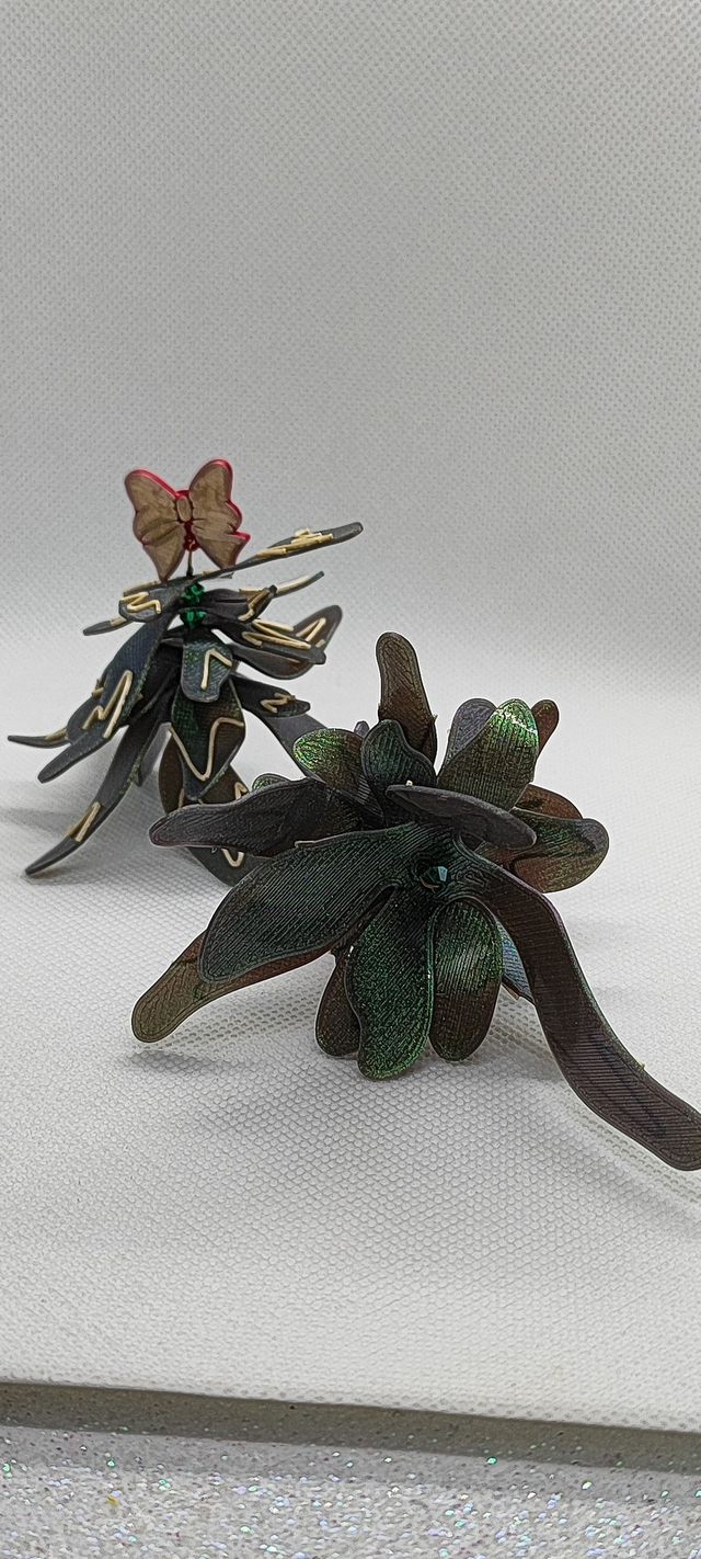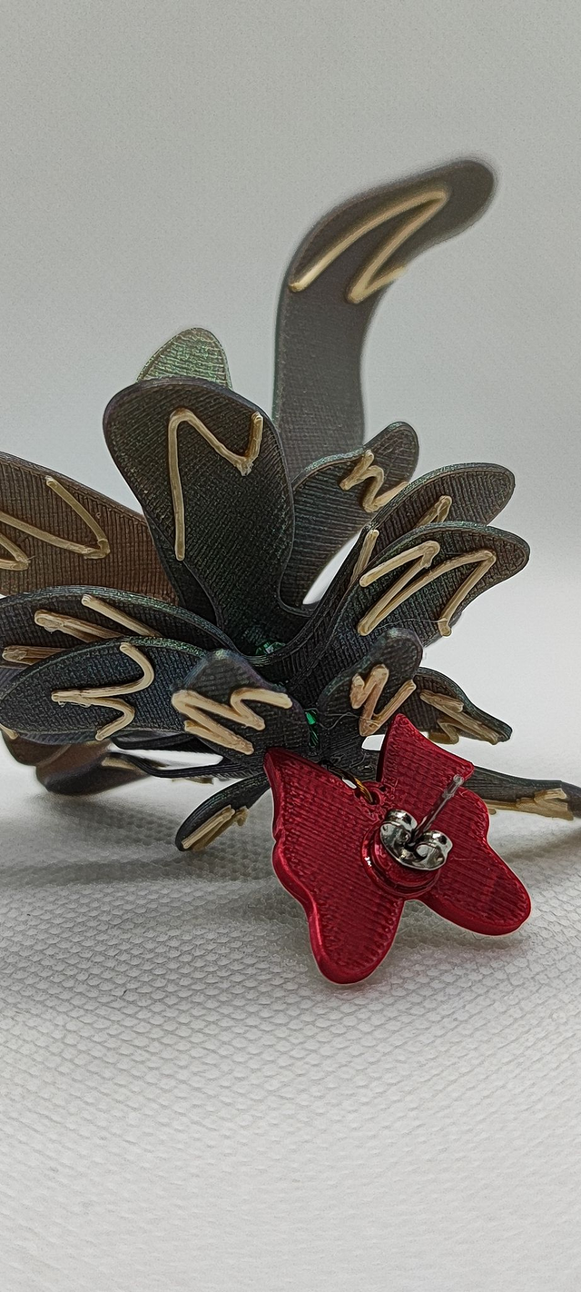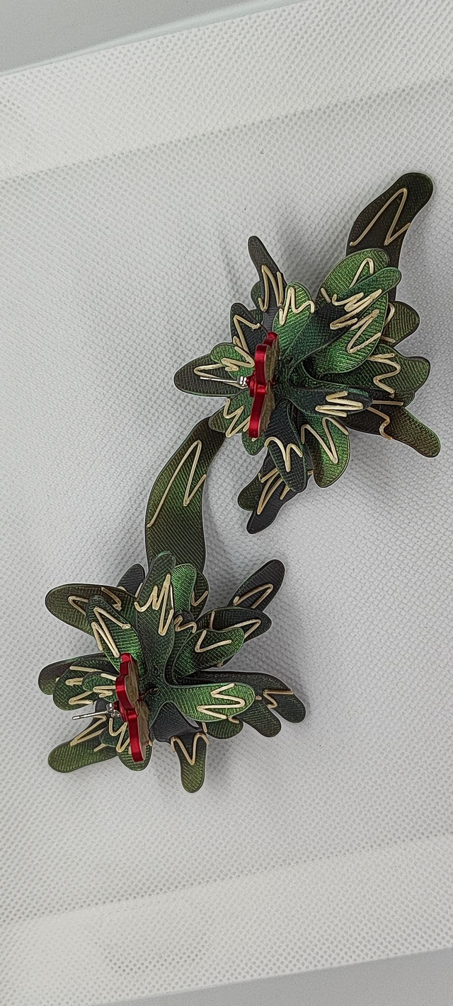 Una obra de arte única que combina el esplendor de la naturaleza con un diseño audaz. Con hojas unidas que simulan las ramas de un árbol, en diferentes alturas, tamaños y formas, este pendiente de gran tamaño presenta un lazo de botón, creando una composición que evoca la majestuosidad de un árbol de Navidad. Hechos a mano, fusionando el arte artesanal con la tecnología de impresión 3D, estos pendientes ofrecen un acabado excepcional.