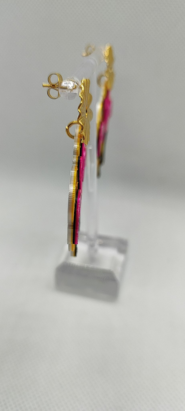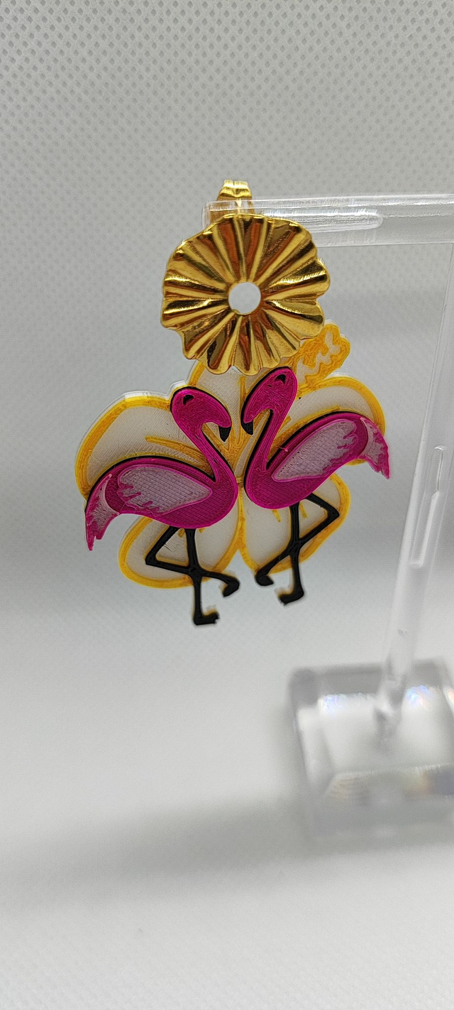 Descubre la magia de estos pendientes medianos únicos, que combinan un elegante círculo estriado dorado con una flor hawaiana y dos flamencos artesanales, creados mediante tecnología de impresión 3D. Este diseño exclusivo fusiona arte artesanal y sostenibilidad, ofreciendo un estilo llamativo y moderno.