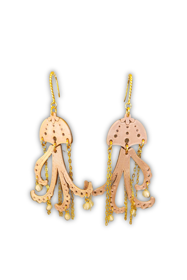 Pendientes de botón de tamaño largo con diseño en forma de medusas, que aportan un toque de frescura y sofisticación a tu estilo. Sus cadenas doradas, con bolas pequeñas en blanco perla, añaden un delicado movimiento, simulando el flujo del agua. Hechos a mano, fusionando la artesanía tradicional con la innovadora tecnología de impresión 3D, estos pendientes son el equilibrio perfecto entre arte y vanguardia.