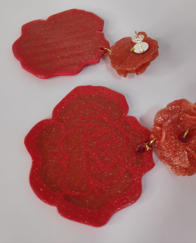 Estos pendientes largos presentan dos hermosas rosas en tonos rojos, diseñadas para captar la luz y reflejar un delicado efecto de terciopelo a través de su acabado traslúcido. La combinación de rojos vibrantes y el sutil brillo del glitter les otorgan un toque de lujo y feminidad, ideales para destacar en cualquier ocasión especial.