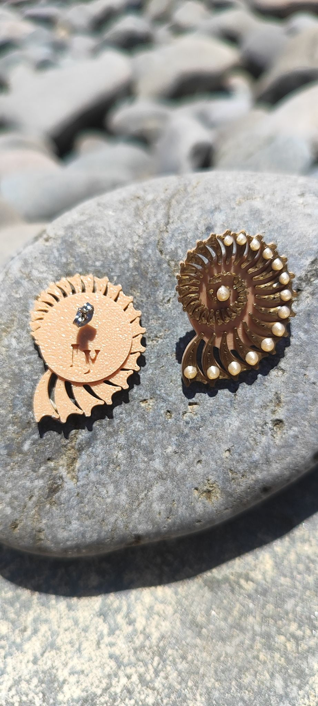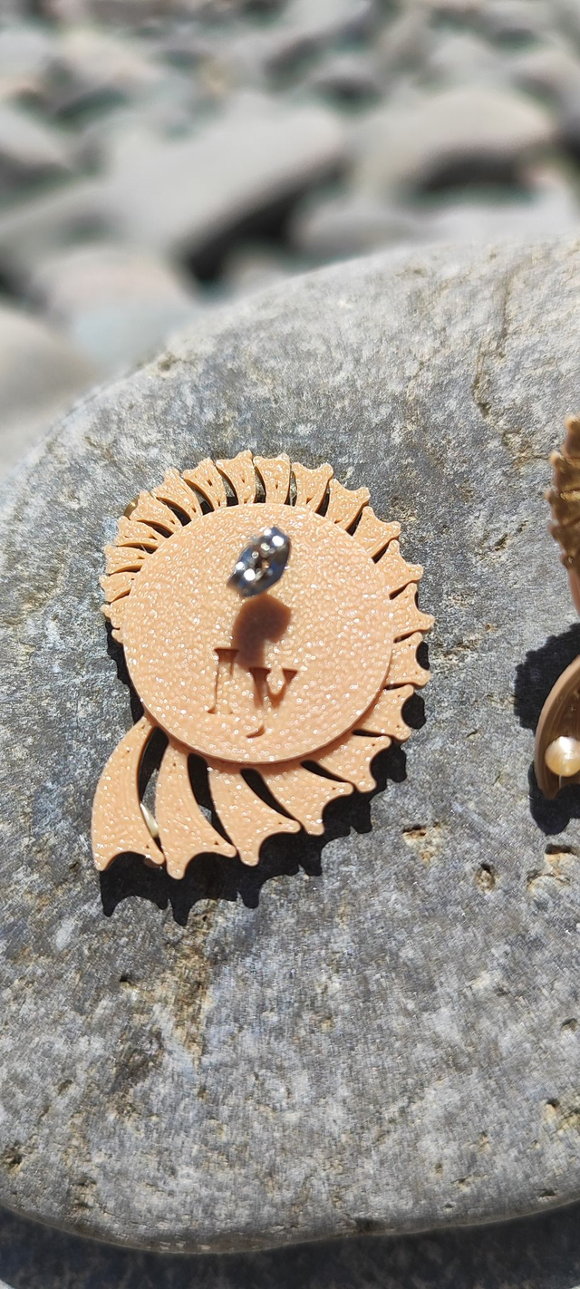 Pendientes de botón de tamaño mediano, con un delicado diseño en forma de caracola, ideales para quienes buscan un toque de naturaleza y elegancia en su estilo. Hechos a mano, fusionando el arte artesanal con la tecnología de impresión 3D, estos pendientes ofrecen un diseño único y sofisticado.