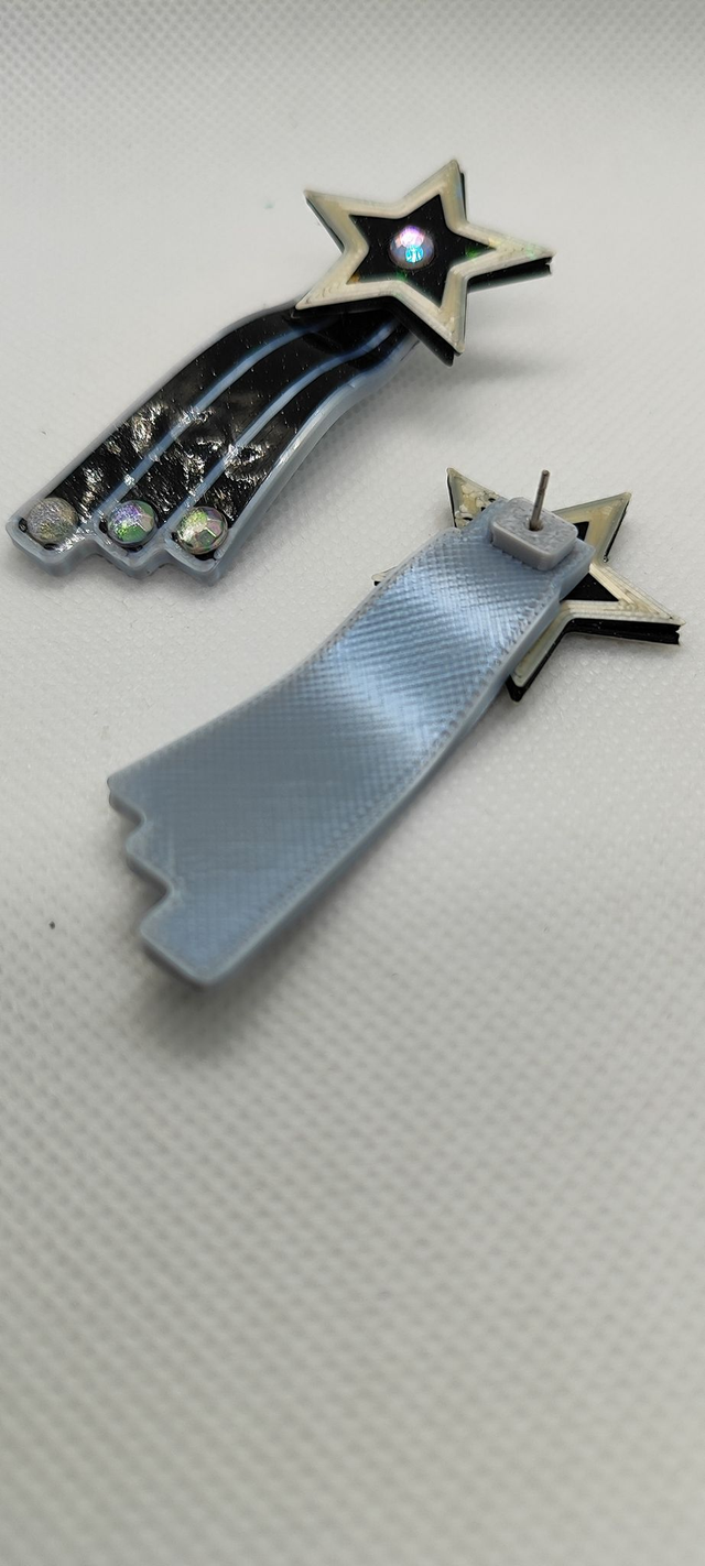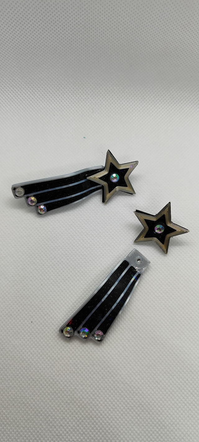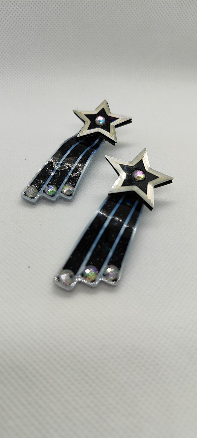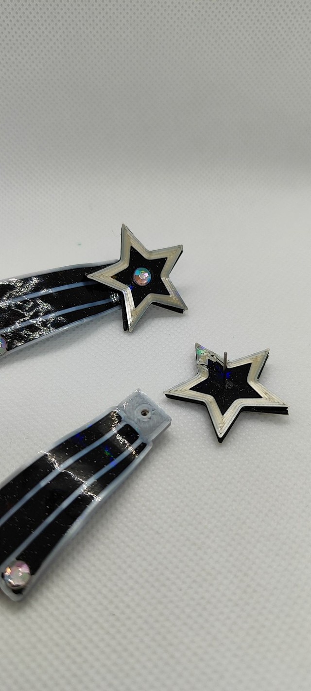 La elección perfecta para añadir un toque de magia y sofisticación a tus looks nocturnos.Una estrella de botón adornada con un strass en su centro, mientras que una elegante cola de estrella se une al cierre, terminando con tres strass que aportan brillo y un efecto de estrella fugaz. Hechos a mano, fusionando el arte artesanal con la avanzada tecnología de impresión 3D, estos pendientes son el accesorio ideal para destacar en cualquier evento.
