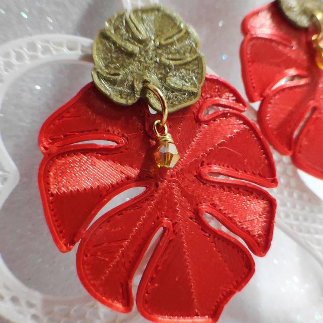 Destaca con estos elegantes pendientes inspirados en la icónica costilla de Adán. Este diseño único presenta dos hojas invertidas en tonos rojo seda y dorado, acompañadas de una bola tallada que cuelga en el centro para añadir brillo. Fusionando arte artesanal y tecnología de impresión 3D, estos pendientes ofrecen un equilibrio perfecto entre sofisticación y sostenibilidad.