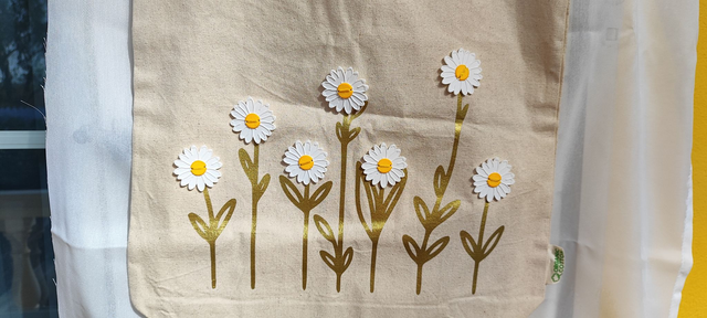 Tote Bag en algodón orgánico con diseño de margaritas en vinilo dorado y flores 3D. Su tono crema suave y asas largas de 70 cm ofrecen estilo y comodidad. Ideal para mujeres conscientes que valoran la belleza natural y la sostenibilidad. Refleja autenticidad, suavidad y empoderamiento femenino.